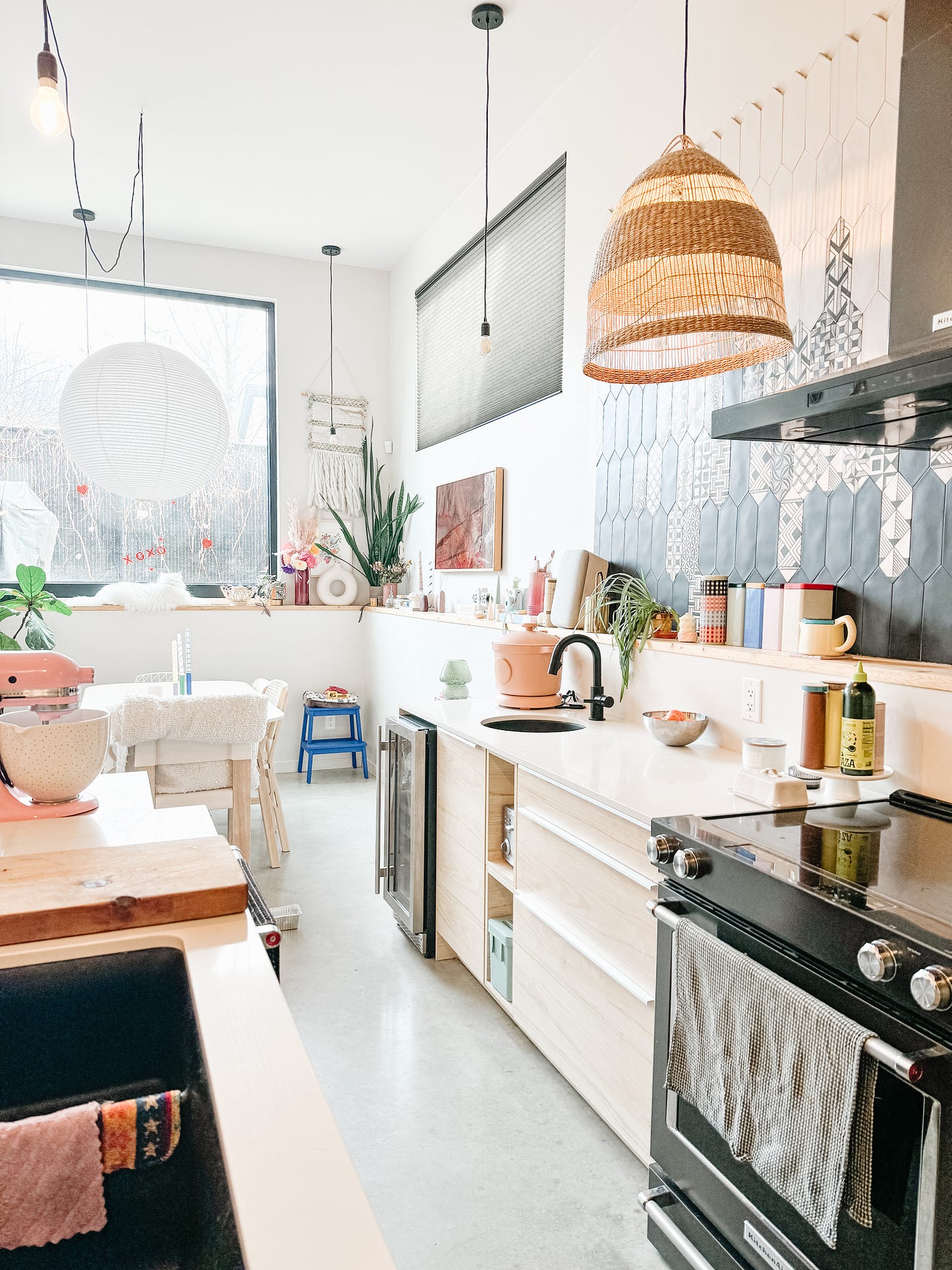 In my dining area right now? Itโs the pink SMEG toaster sitting pretty against that black tile. The terracotta plant pot with flowers on the table. The red and white gingham bag tossed over the chair (itโs giving French picnic meets Venezuelan abuela and Iโm here for it). The pastel cups on the counter. The colourful cookbooks on the shelves. The pink glass candlesticks on the dining table.