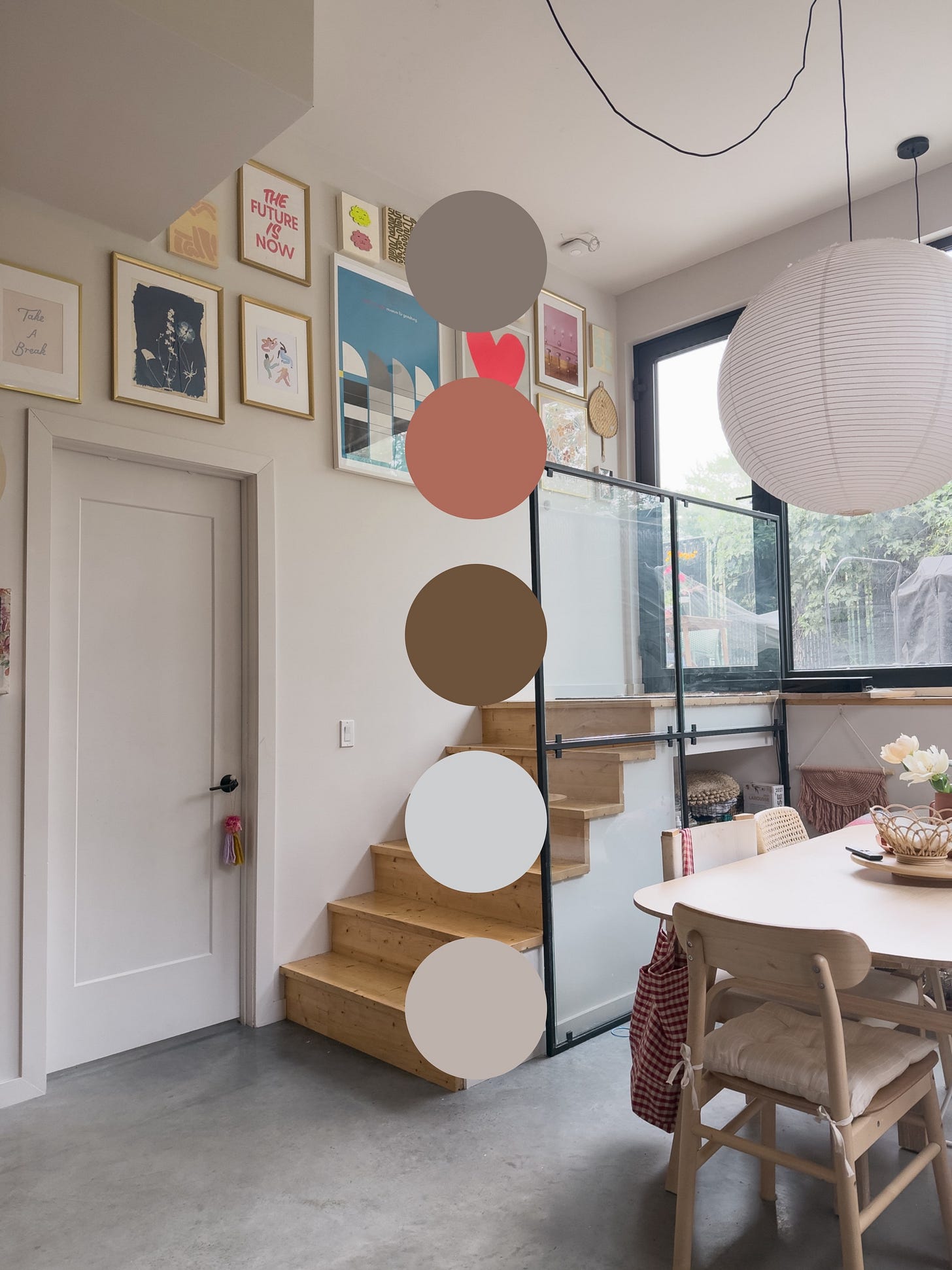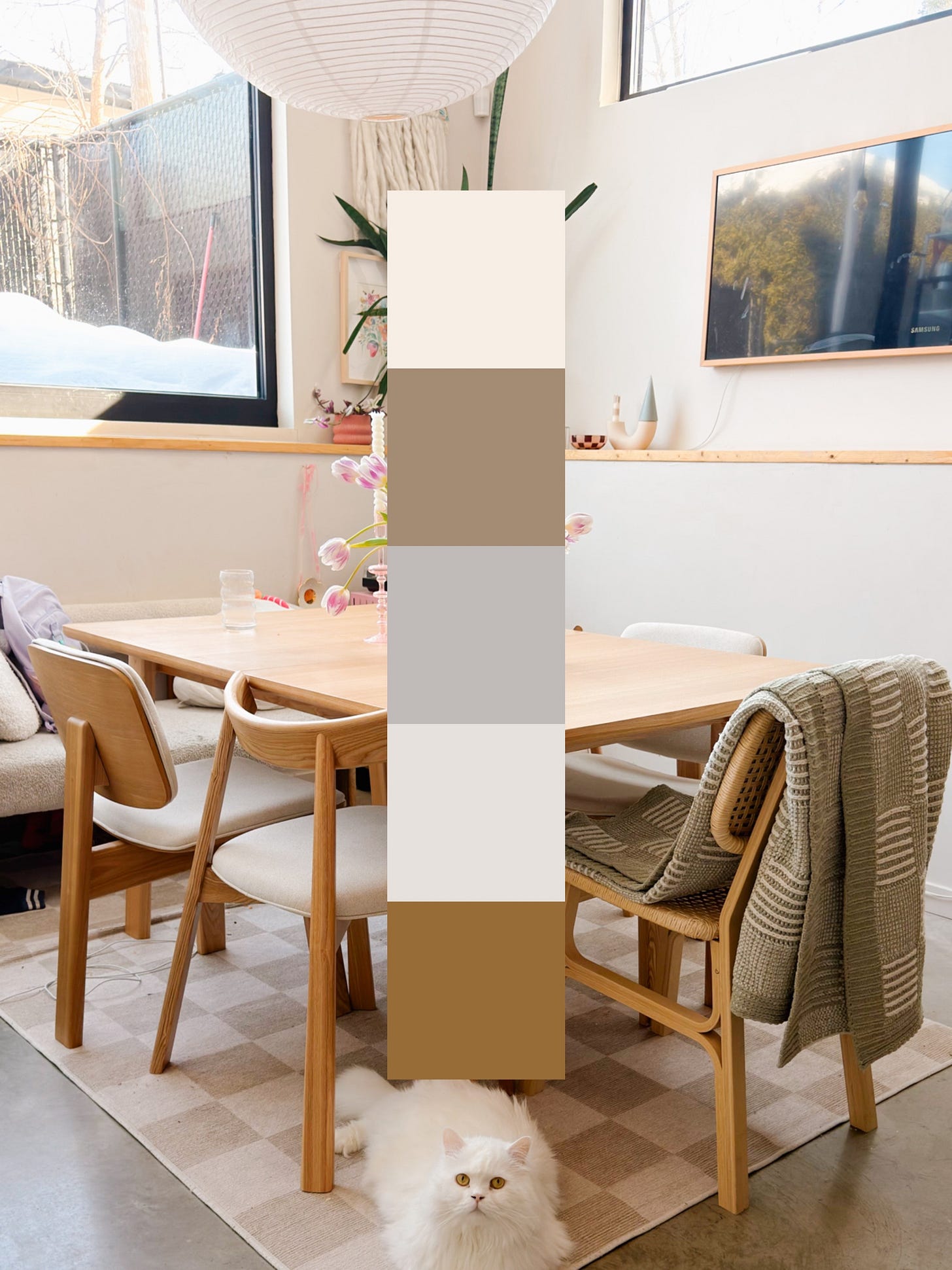 Let me intro you to the substantial layer where the palette really starts to take shape. In my dining area, thatโs the oak shelf rail that runs along the wall, the pine stairs just steps away, and all my light wood furniture as the dining table, the chairs, the open shelving.